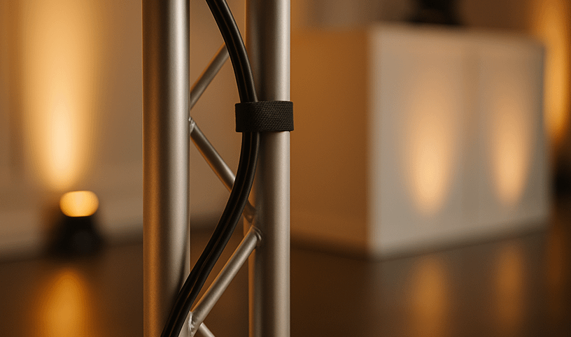 Keep it simple: Velcro ties, gaffer tape, and cable sleeves. Route everything along truss legs or under risers. Hide power strips behind your facade. The goal is to make your setup look effortless, even if it took an hour to prep.