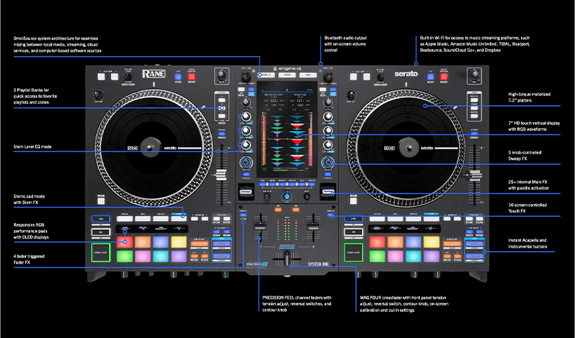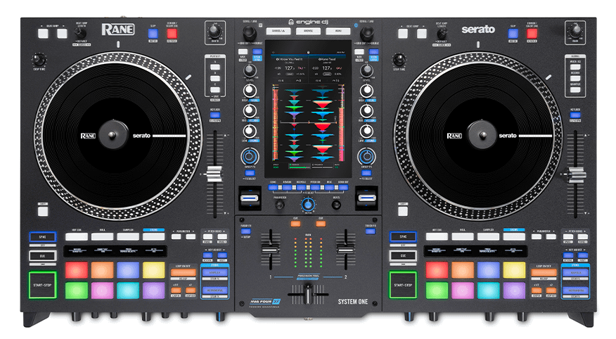SYSTEM ONE is the first RANE product to feature Engine DJ built in, meaning you can load tracks, browse your library, stream music, mix, perform with Stems, trigger FX, control lighting, and run full professional sets without ever opening a computer.